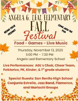 Disfruta de presentaciones en vivo por el coro, equipo de porristas, grupo folklórico, y estudiantes de PK, Kinder y 1er grado de AGL — además de invitados especiales de San Benito High School incluyendo Conjunto Estrella, Jazz Band, Flamenco y Grupos de Mariachi.✨